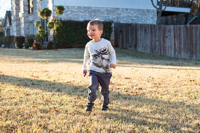 Right now, Felicity likes to be silly when you're putting her down for the night, but if you say "are you ready for bed?" she burrows into you. She started saying Wilder's name - more like "wowduh" and it's so cute. A friend of ours said Felicity is a "participant in her life" and it's so true. She gets into everything and is constantly DOING things. It's interesting in contrast to Wilder. I feel that he really likes to narrate his life. He still does things, but is very much interested in talking about it as he does it. Felicity now has more hair than I do, and it's like princess hair: perfect curls, no frizz! Right now, I think I can say this because I know she'll grow out of it, but Felicity runs just like an orangutan. She's still figuring out how to walk. It's so funny.